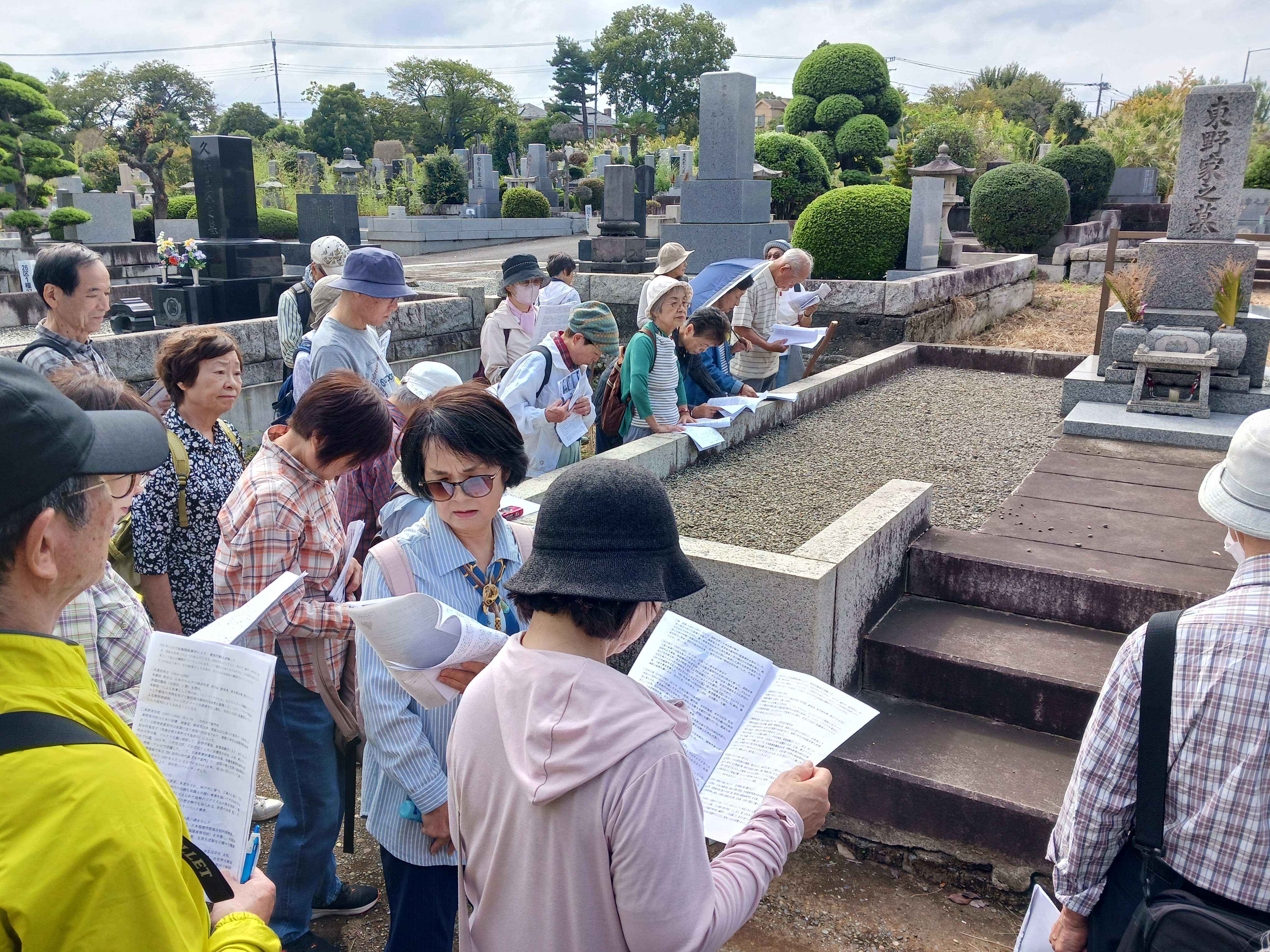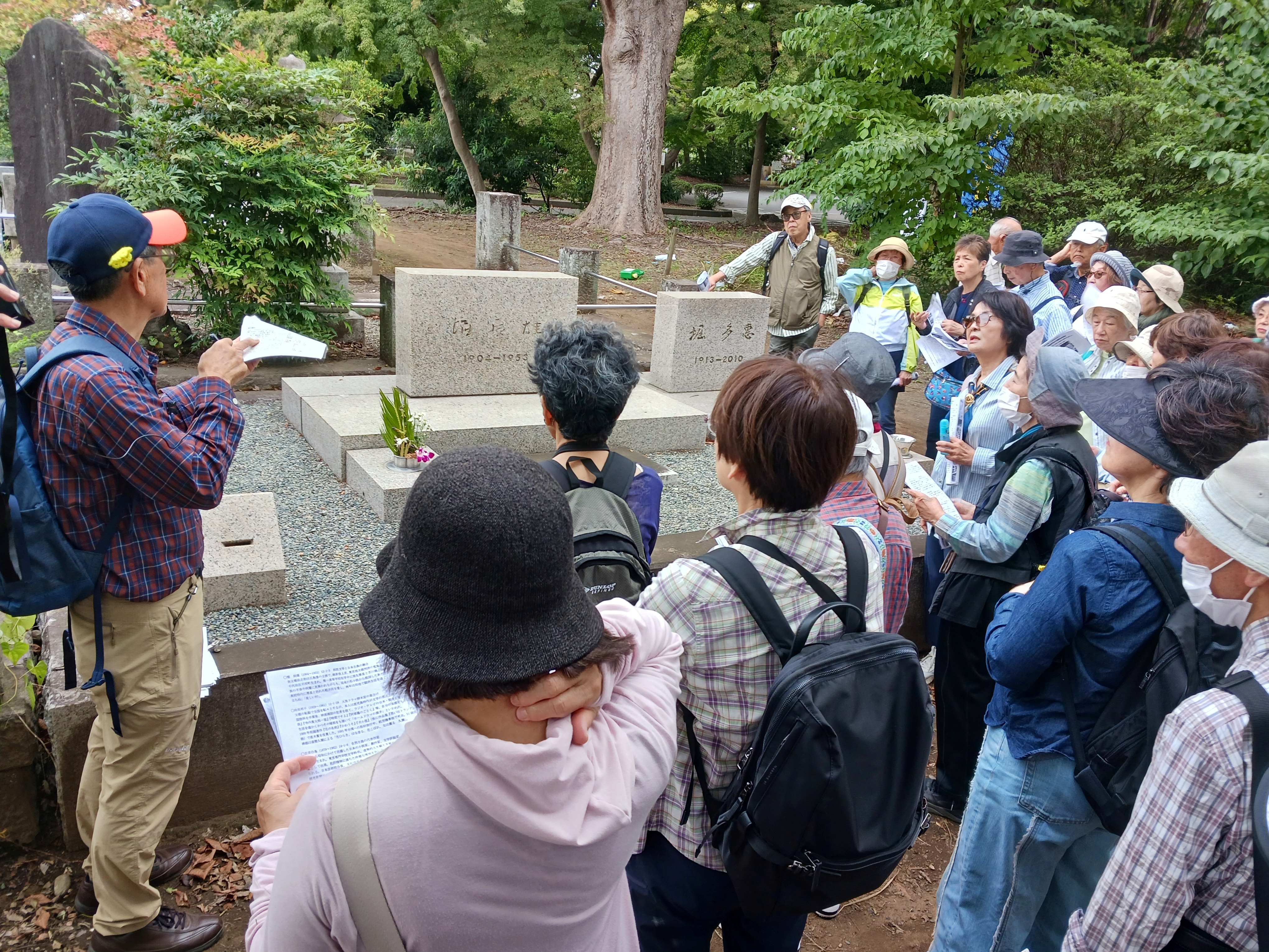 9時30分に小金井門集合で、近くの広場で記念撮影をして、多磨霊園の概要を説明した後出発。最初のお墓は菊池寛、文豪にして後進育成のため文藝春秋社を設立し小説家の登竜門である芥川賞、直木賞を創設した大御所である。次に石川泰三、官僚から第一生命社長になりその後経団連会長を3期務め財界の総理とも言われた人物である。第一生命本社ビルは戦後GHQに接収され、彼の使用していた社長の机と椅子をマッカーサーがそのまま使ったエピソードを紹介した。続いて野村胡堂、田山花袋、堀辰雄、向田邦子、田河水泡、江戸川乱歩など14名の略歴、業績を人物像が分かるように説明した。これらの人物は参加者にも馴染みがある人が多く、昔読んだ小説などに思いを馳せた事だろう。お墓巡り終了後、
